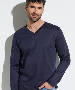 Zimmerli Men’s Loungewear Supreme Green Cotton | T-shirt Long Sleeve V-neck – Navy | Navy