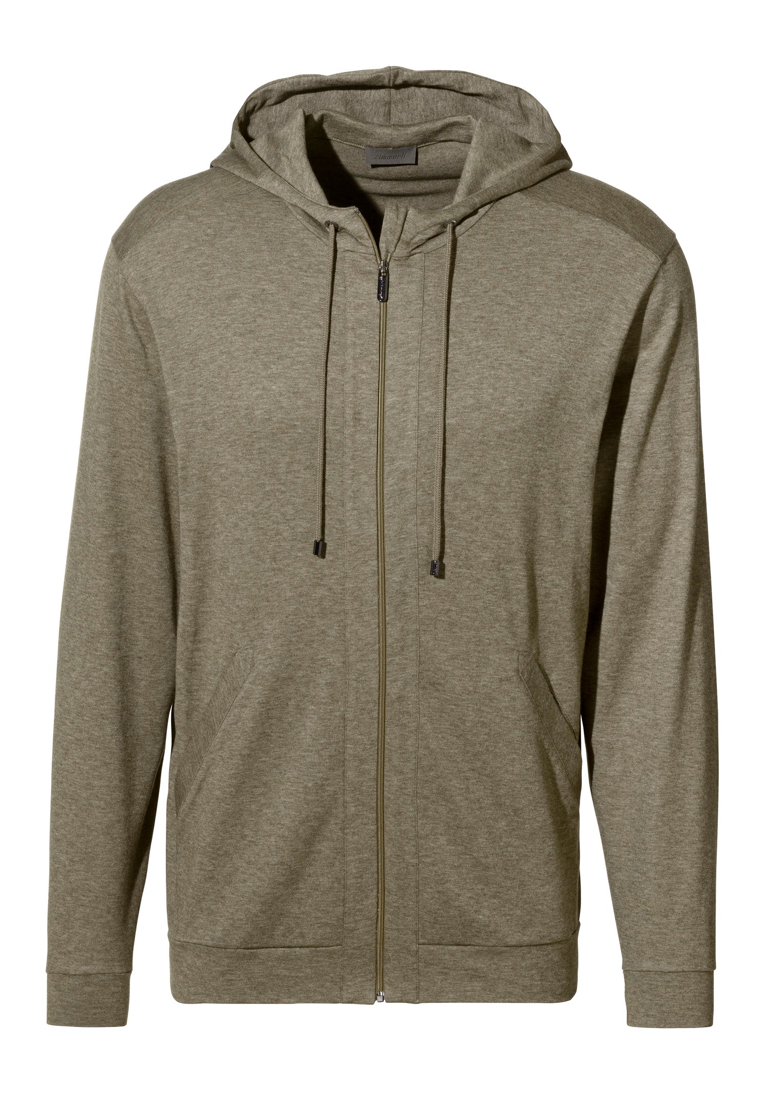 Luxurious, warming and yet light in a trendy melange look. The hoodie with long sleeves for men has slightly slanted front pockets and a full-length zipper. The dark grey zipper is made of metal with an engraved Zimmerli of Switzerland logo and is covered by a fabric flap at the neckline. The cord ends and eyelets are also decorated with the metal elements and logo. There are two decorative seams at the centre front that run parallel to the zipper and the seam at the shoulders is also offset to the front. The two side pockets were inserted almost invisibly from the inside of the jacket and are bordered with ribbon. The style is modern and casual yet remains minimalistic and simple. An elastic waistband at the hem and sleeves provides a comfortable fit and the full-length zipper allows a lot of flexibility in styling.