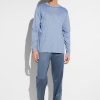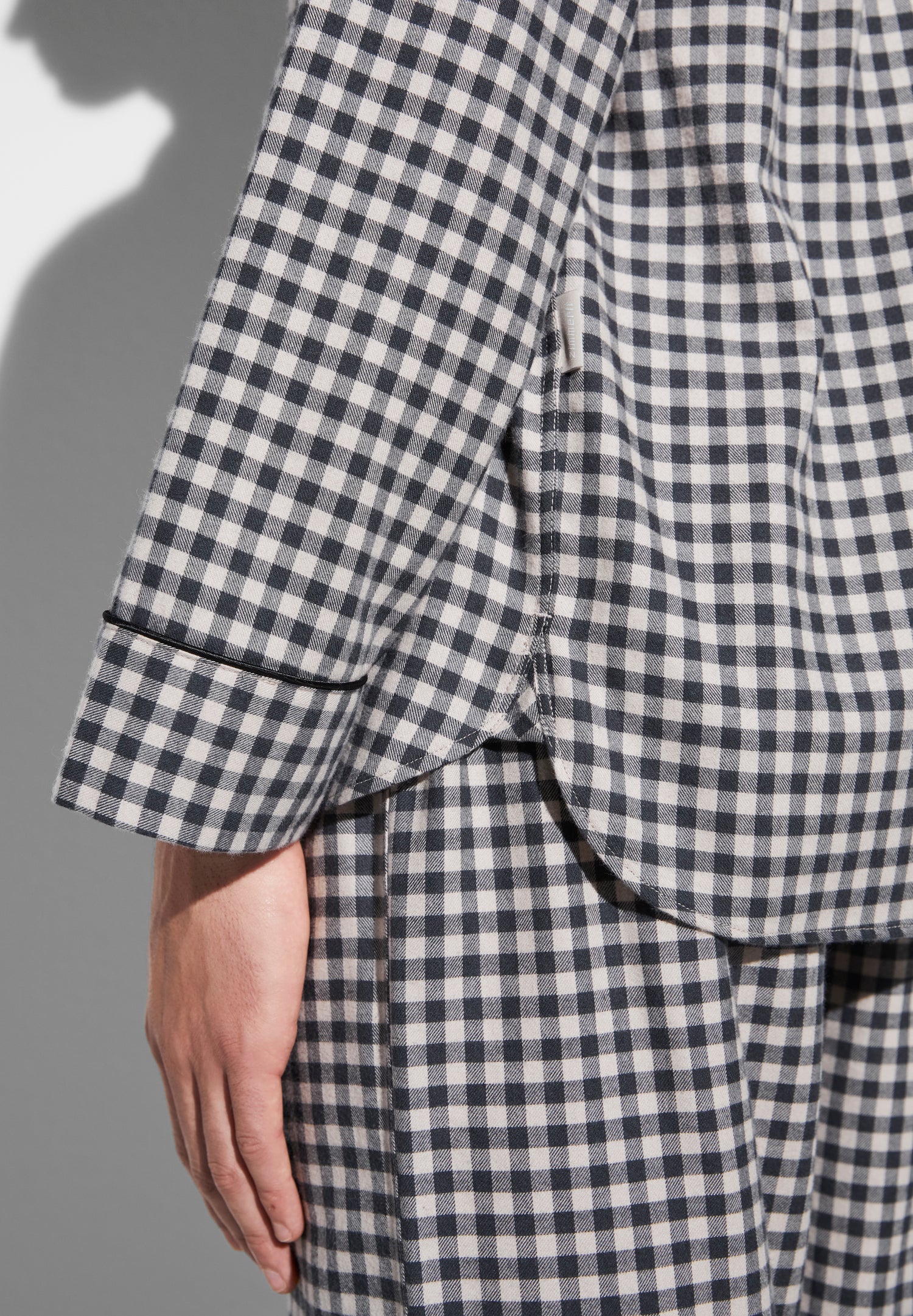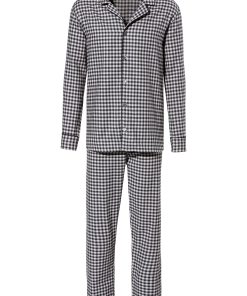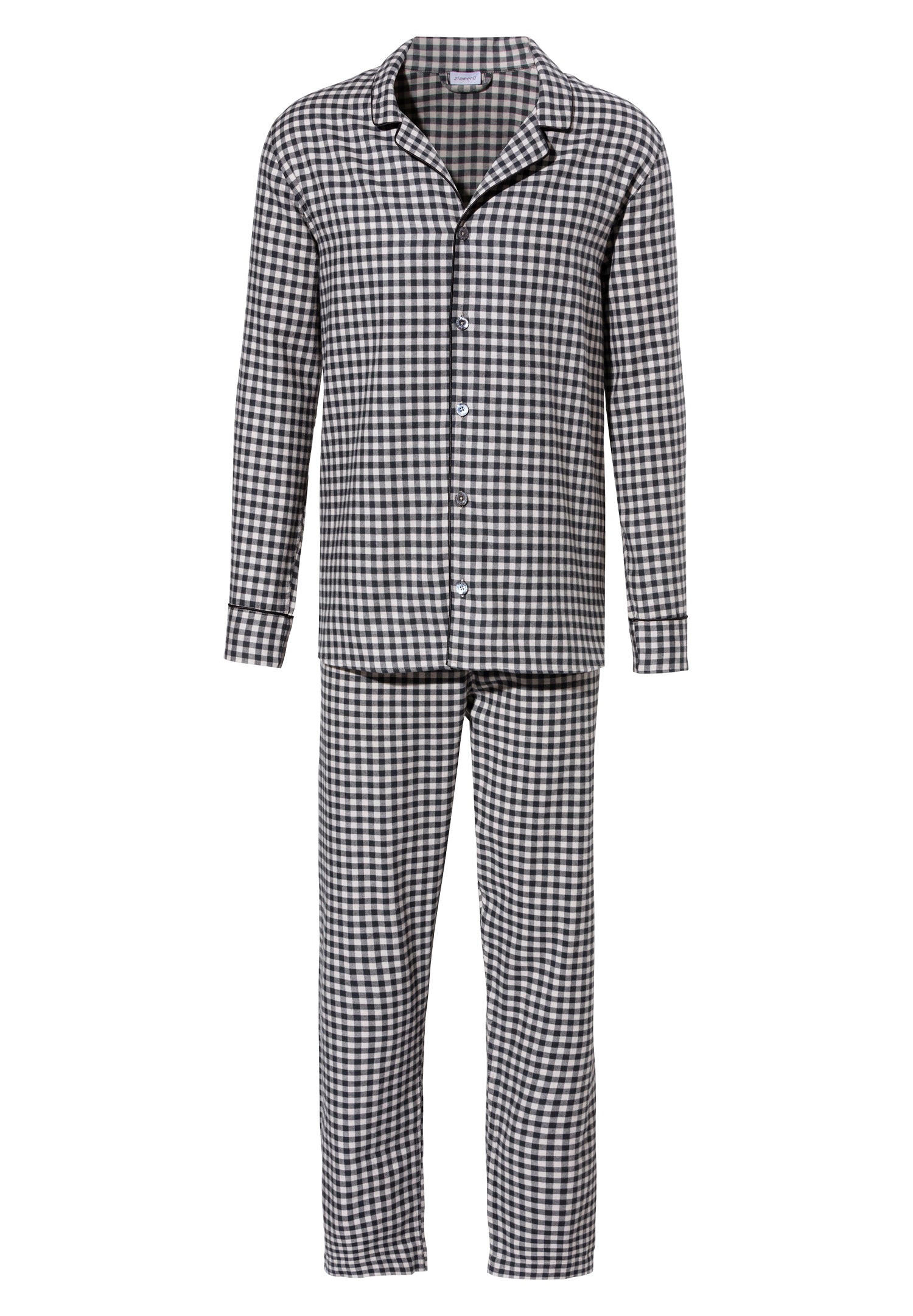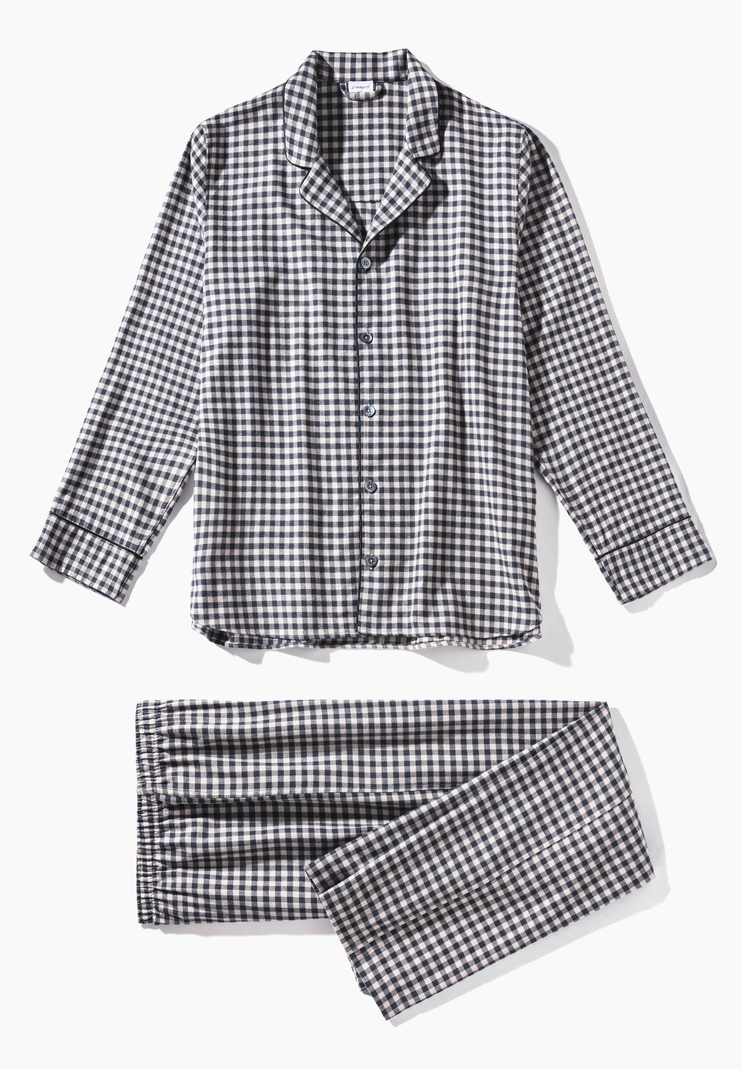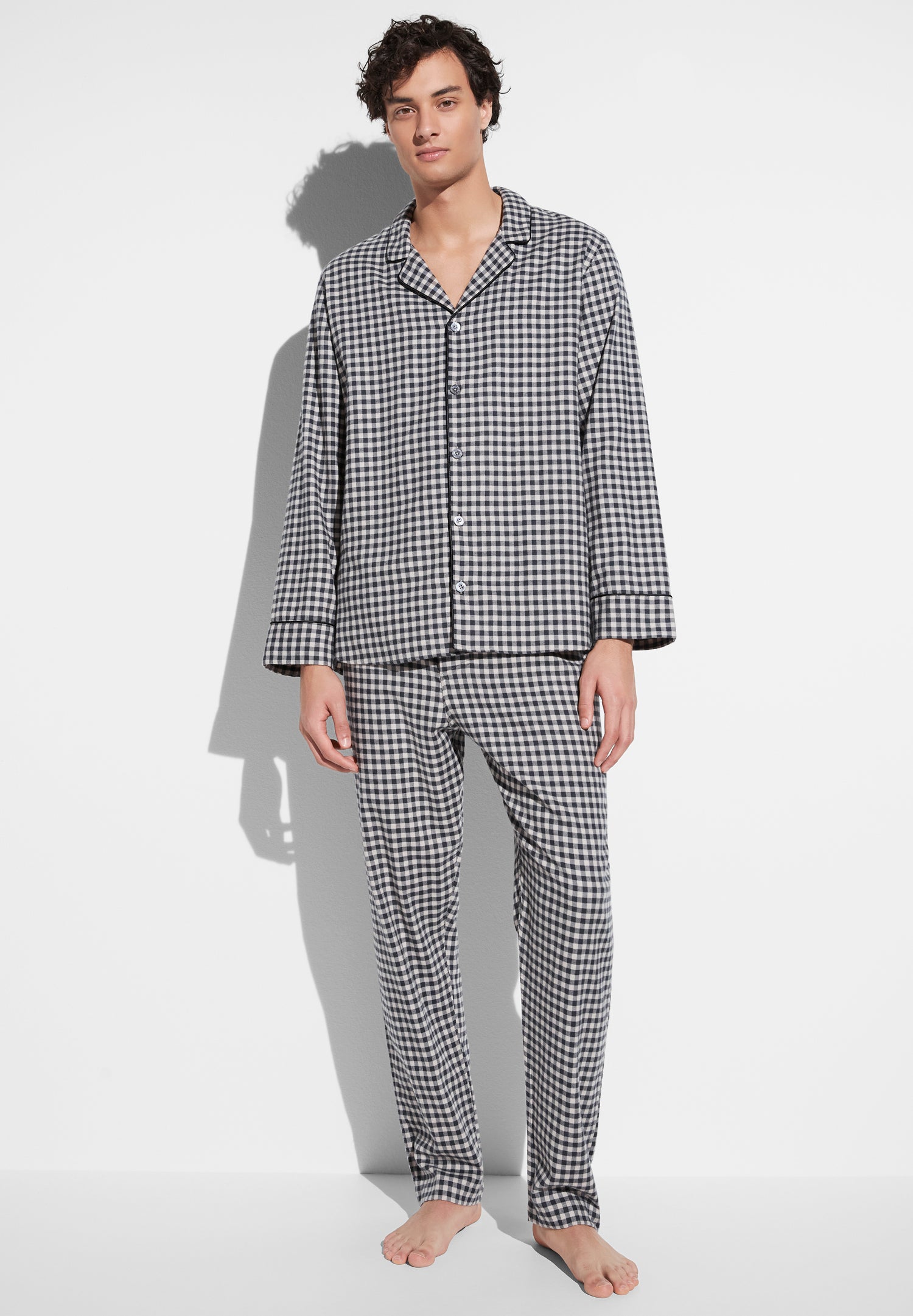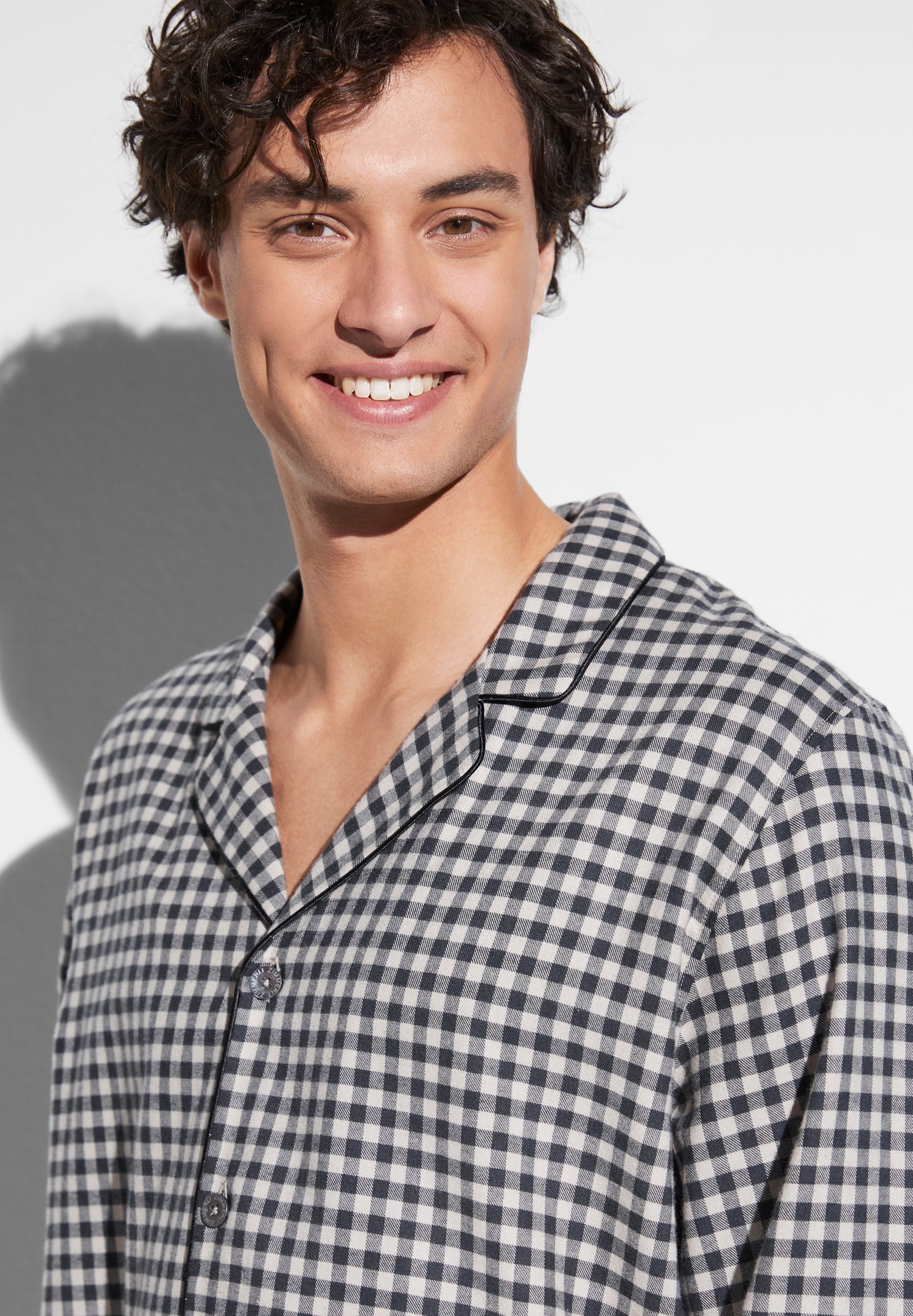 Cosy and soft, warm and a perfect companion for the night. The long flannel pyjamas for men with long sleeves and trousers are a small highlight with subtle piping depending on the colour chosen. The top of the pyjamas has a notch collar and is closed with a full-length button placket with five mother-of-pearl buttons. The collar and button placket are set off with piping – the same applies to the two sleeve ends. The long pyjama trousers are cut straight and have an elasticated waistband, the extra-soft waistband band fits perfectly to the body. The long men’s pyjamas from the Cozy Flannel line are made of a particularly soft cotton fabric with a touch of warming wool. The flannel fabric is warm, light and absorbs moisture particularly well. A cosy companion for your nights.
