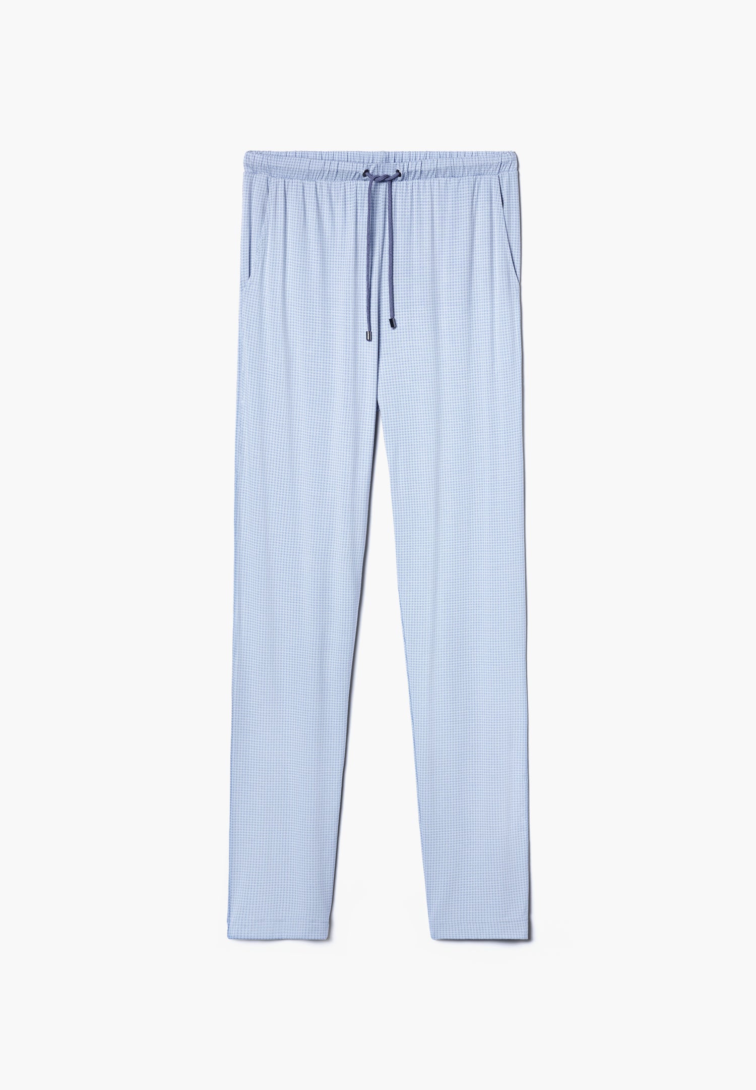 Superior softness and temperature balancing meets decorative print. These long pants for men impress with a hidden, elastic waistband and additional drawstring with cord for fine adjustment. The ends of the cords as well as the cord eyelets are finished with grey metal elements on which the Zimmerli of Switzerland logo has been engraved. There is a slightly slanted pocket on each side. The cut is loose and comfortable offering enough freedom of movement.