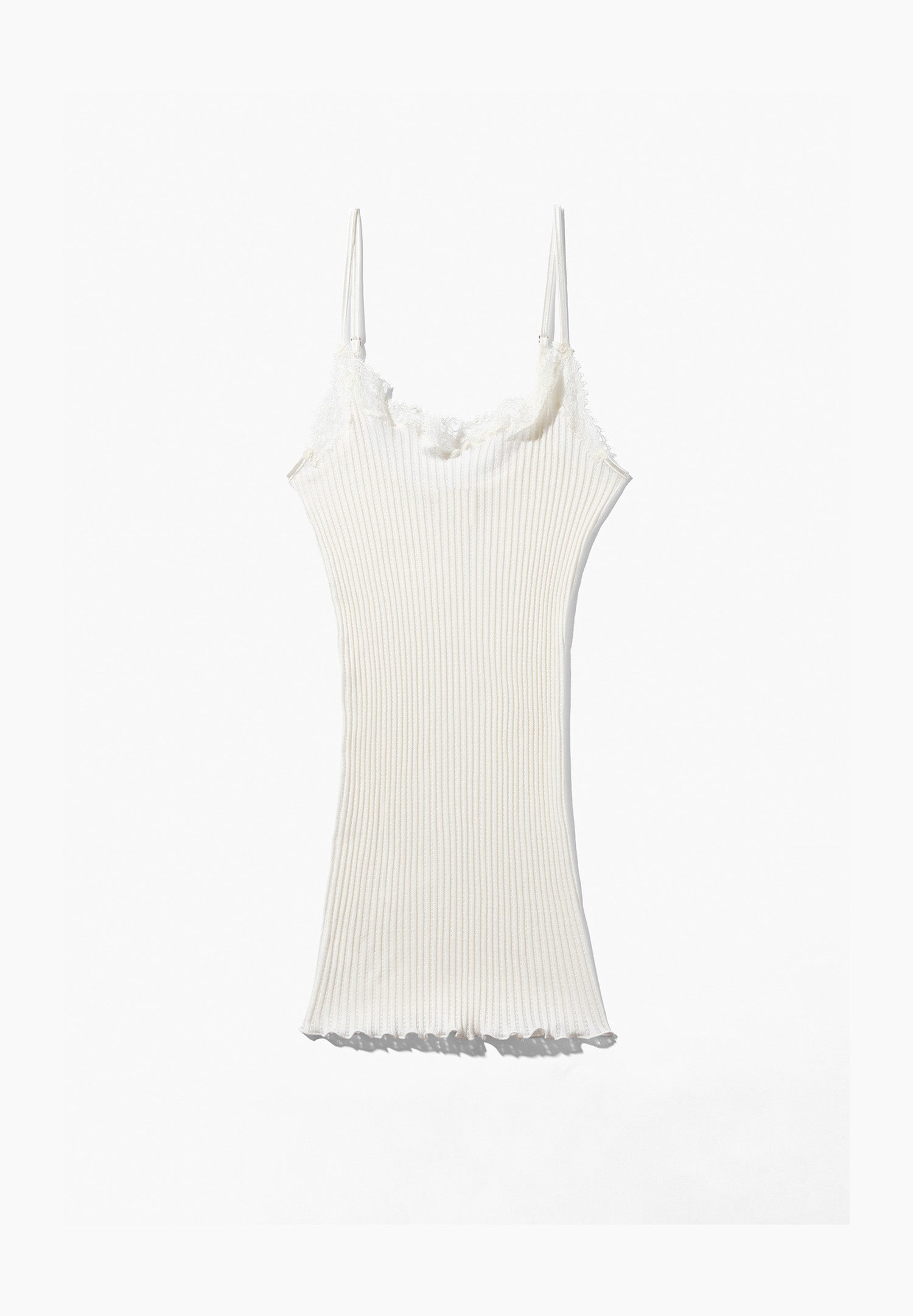 The airy Ajouré ribs conceal small works of art. Intricate patterns interweave the pure cotton of this spaghetti top with adjustable straps, which is topped-off with delicate Calais lace. All this luxury is only possible with exquisite craftsmanship that makes it perfectly wearable as a top.