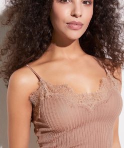 One-of-a-kind thin Richelieu fine rib fabric with two differently wide ribs decorated with delicate, floral eyelash lace. The spaghetti top for women impresses with a wavy V-neck which is trimmed with eyelash lace. At the centre of the neckline the lace details meet and cross each other. The armhole openings are also decorated with lace. The back neckline, the back of the armhole openings and the delicate straps are bordered with a shimmering satin band. Small, golden adjusters at the back allow the length of the straps to be changed to fit your needs. The hem is slightly ruffled as a result of a special sewing technique.