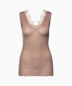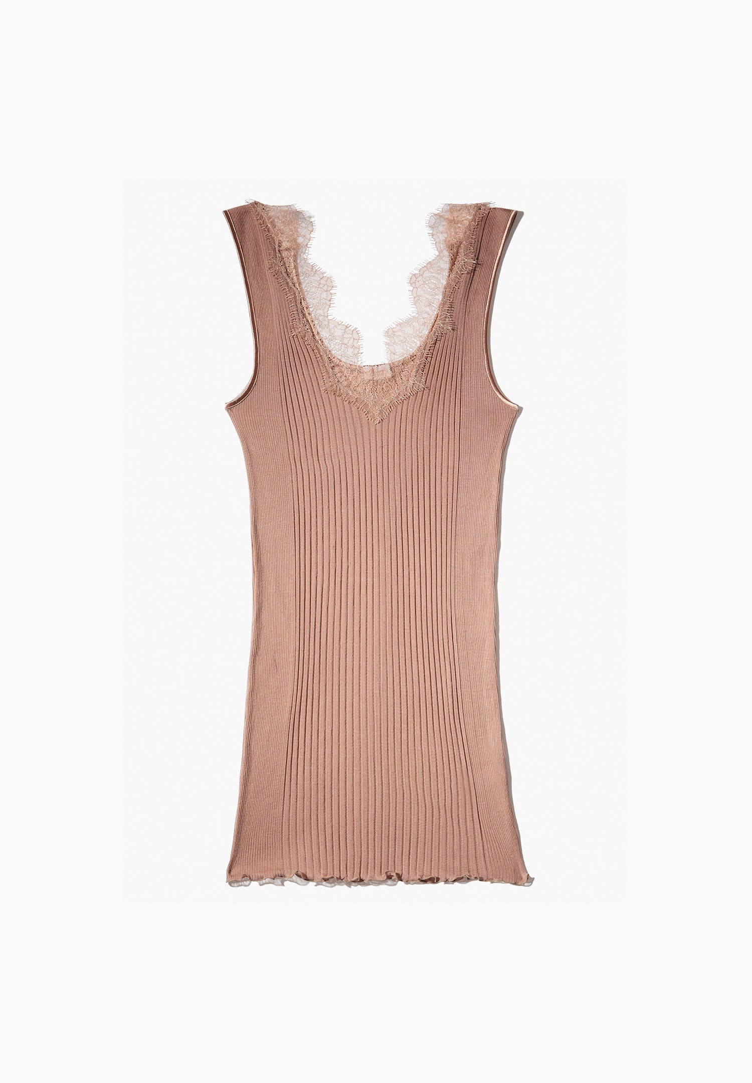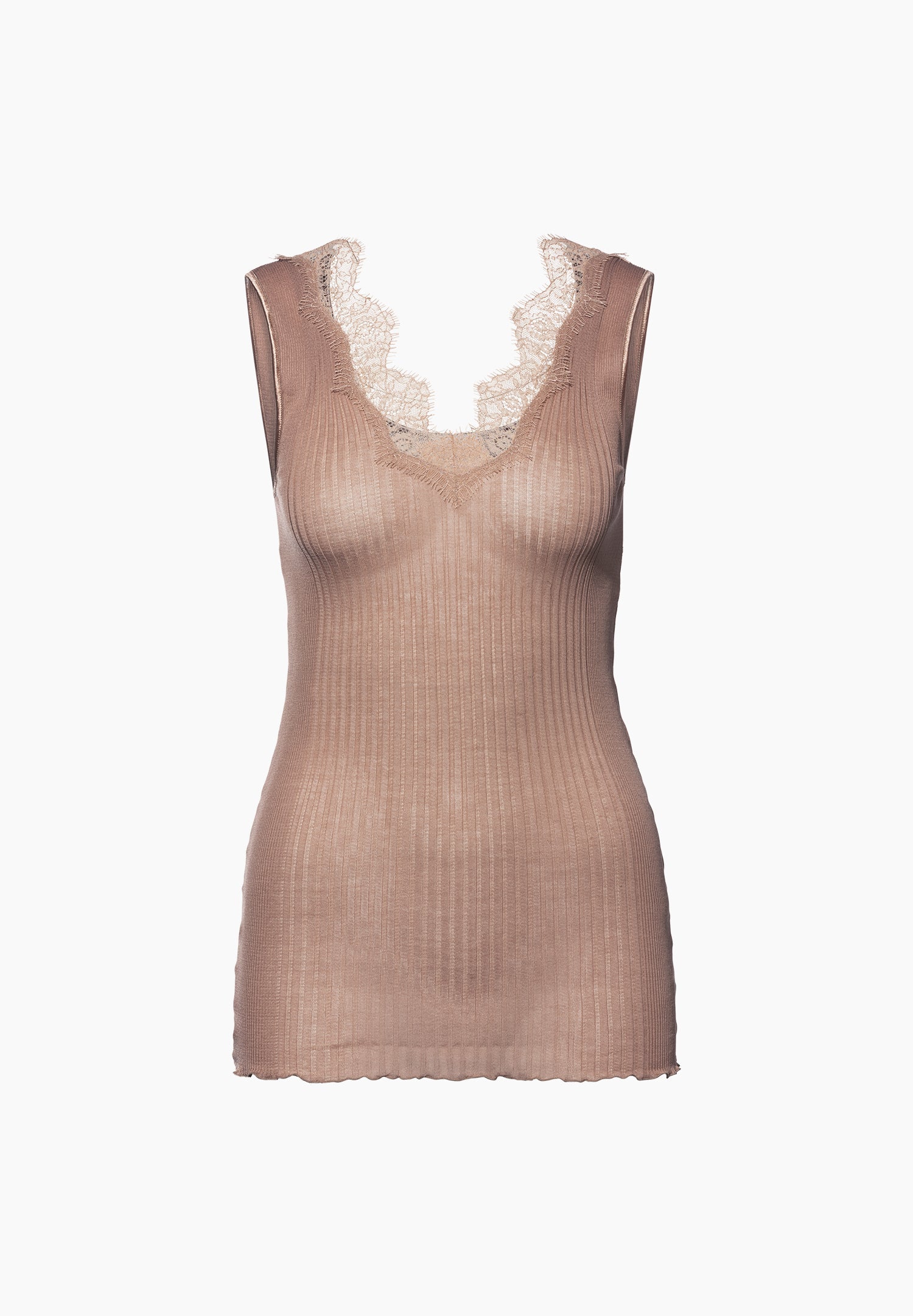 One-of-a-kind thin Richelieu fine rib fabric with two differently wide ribs decorated with delicate, floral eyelash lace. The top with broad straps for women charms with a deep, wavy V-neck which is trimmed with eyelash lace. At the centre of the neckline the lace details meet and cross each other. The back neckline as well as the armhole openings are bordered with a shimmering band. The hem is slightly ruffled as a result of a special sewing technique.