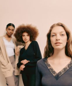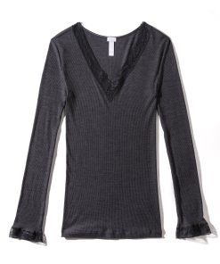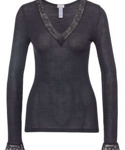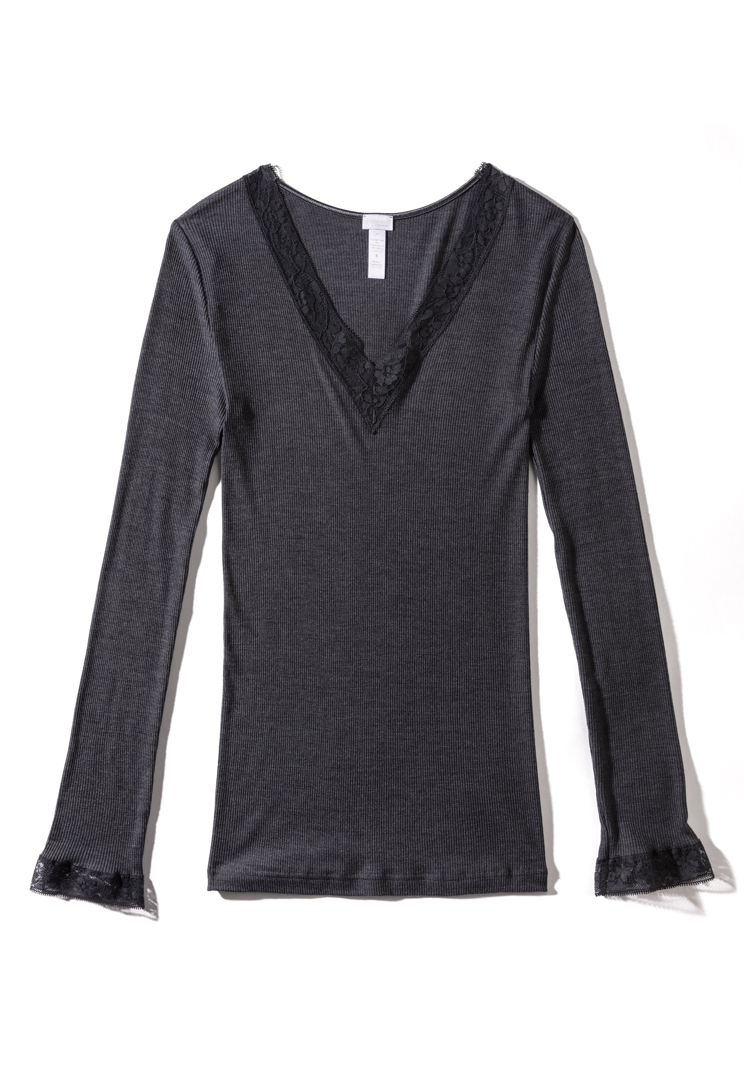 Fine rib fabric with a subtle structure and made of noble wool-silk material featuring a lace decoration of delicate blossoms. The long-sleeved shirt for women impresses with a V-neck which is trimmed with high-quality lace. At the centre of the neckline the lace details meet and cross each other. The high back neckline is bordered with a shimmering band. At the hem of the slim-fitting, long sleeves is trimmed with lace. This piece is crafted by using the seamless circular knitting process to create a comfortably tight, figure-hugging fit.