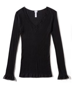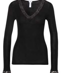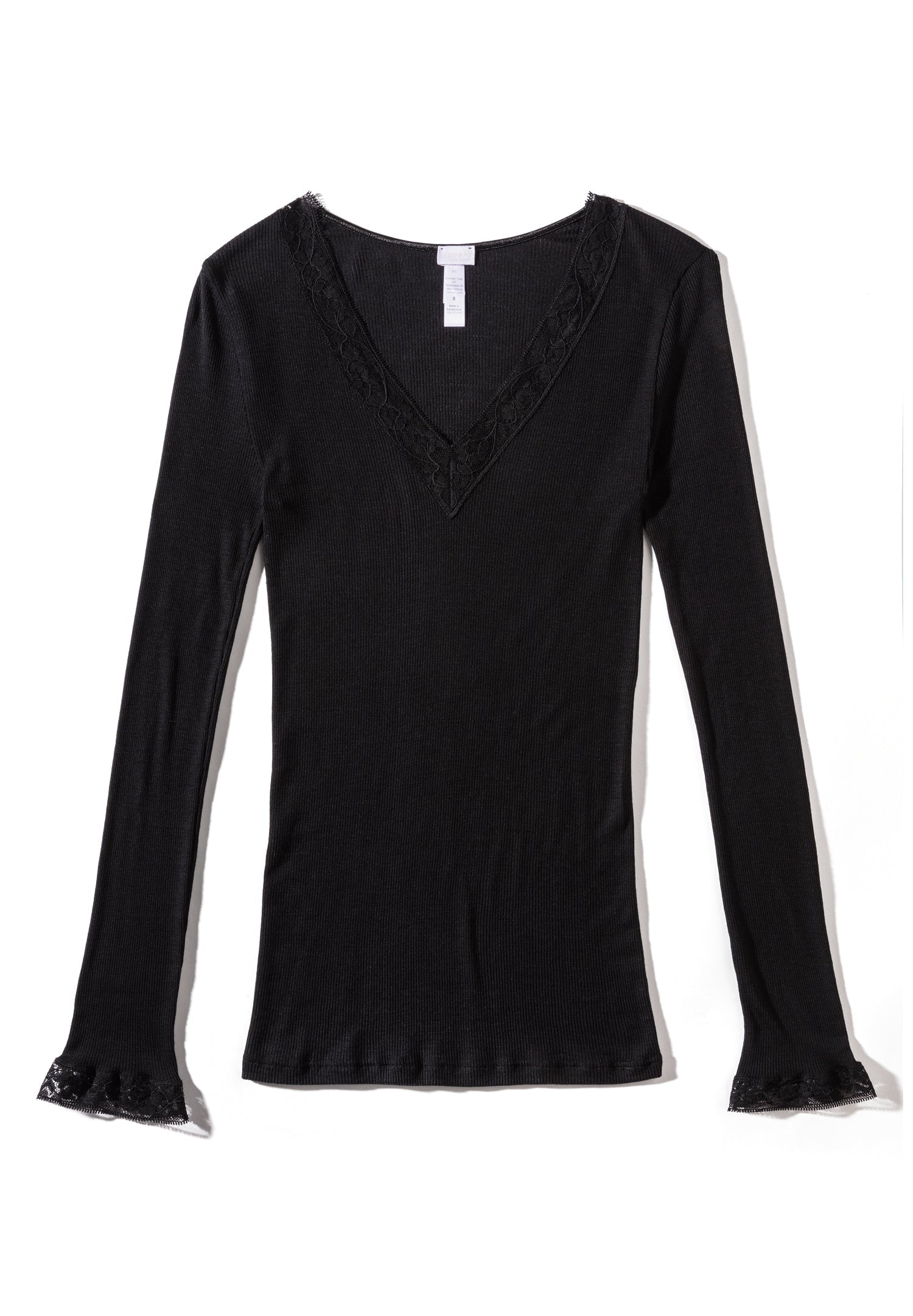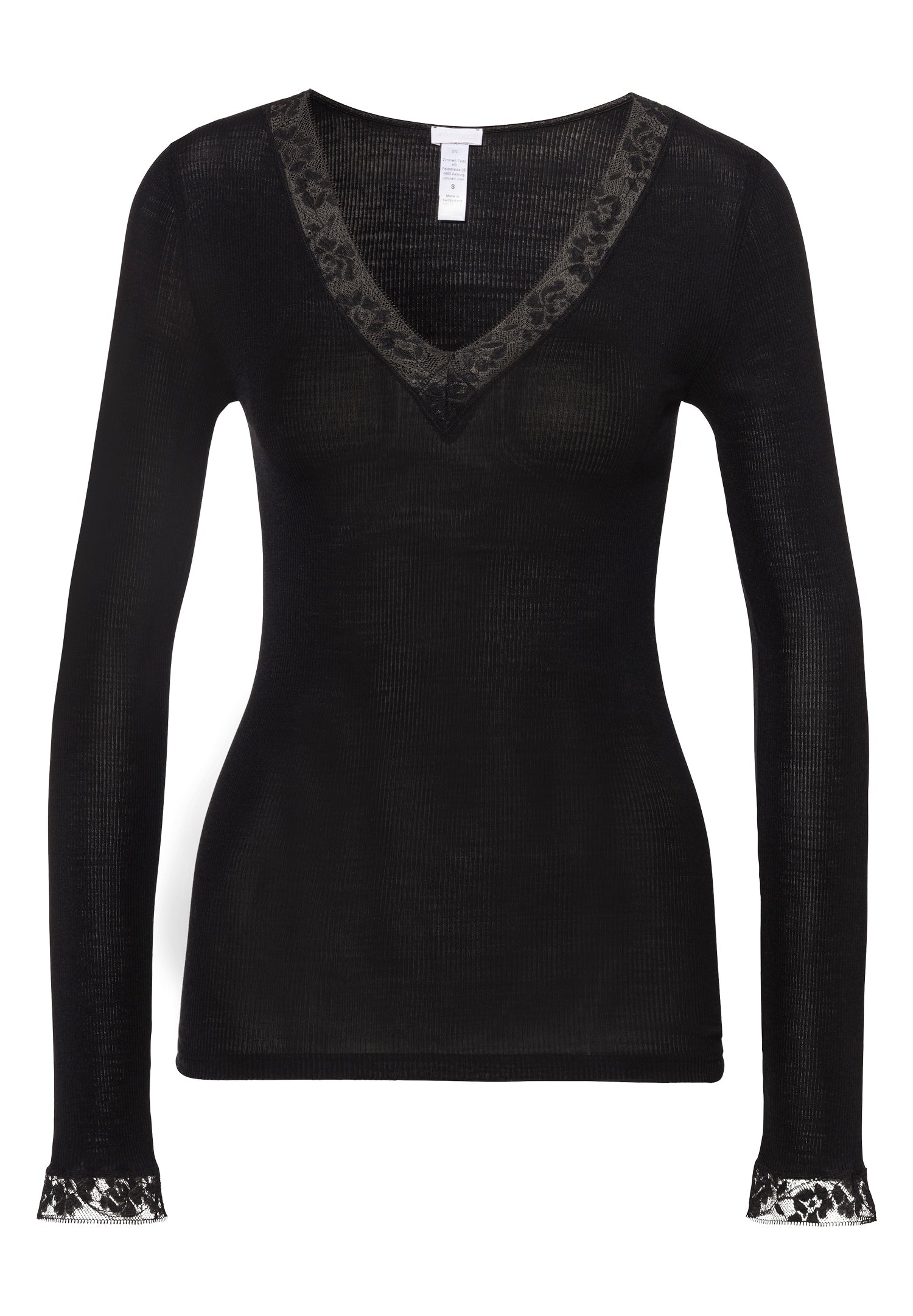 Fine rib fabric with a subtle structure and made of noble wool-silk material featuring a lace decoration of delicate blossoms. The long-sleeved shirt for women impresses with a V-neck which is trimmed with high-quality lace. At the centre of the neckline the lace details meet and cross each other. The high back neckline is bordered with a shimmering band. At the hem of the slim-fitting, long sleeves is trimmed with lace. This piece is crafted by using the seamless circular knitting process to create a comfortably tight, figure-hugging fit.