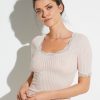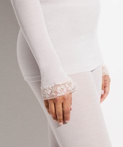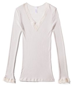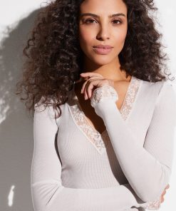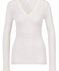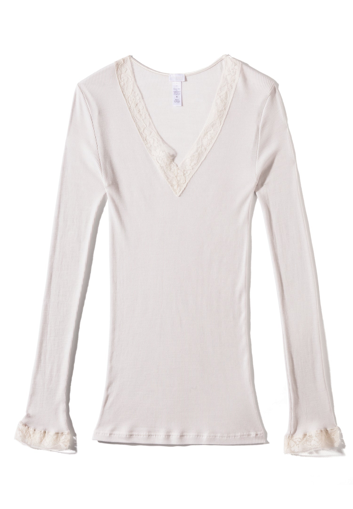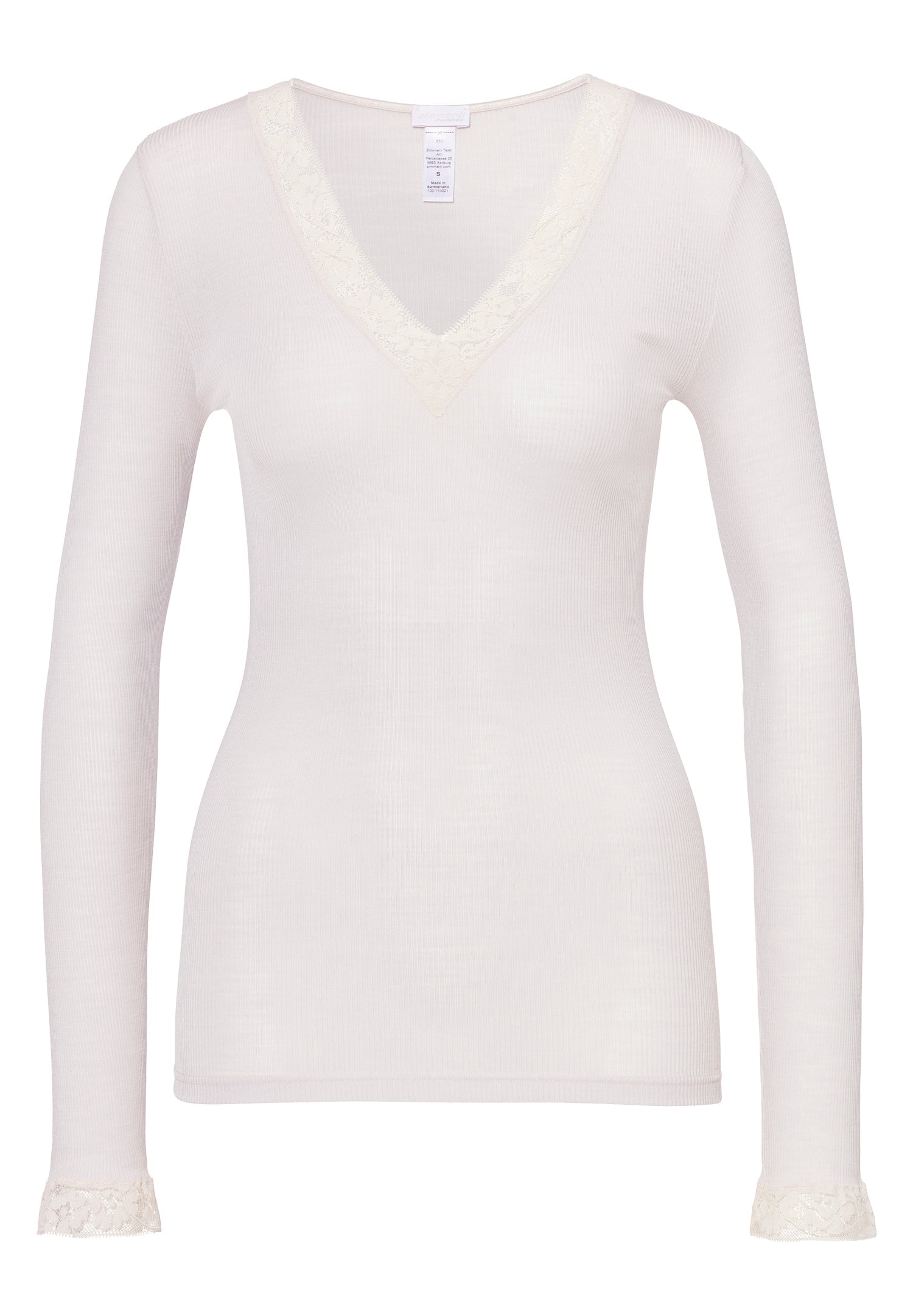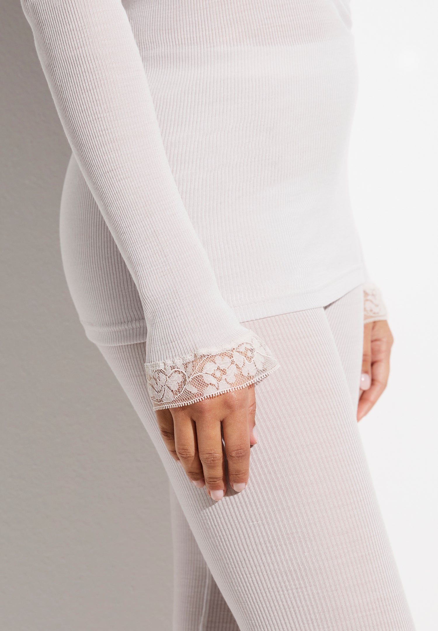 Fine rib fabric with a subtle structure and made of noble wool-silk material featuring a lace decoration of delicate blossoms. The long-sleeved shirt for women impresses with a V-neck which is trimmed with high-quality lace. At the centre of the neckline the lace details meet and cross each other. The high back neckline is bordered with a shimmering band. At the hem of the slim-fitting, long sleeves is trimmed with lace. This piece is crafted by using the seamless circular knitting process to create a comfortably tight, figure-hugging fit.